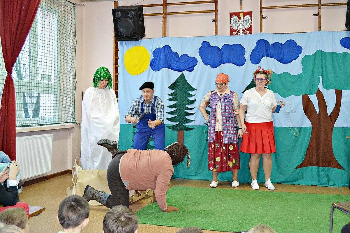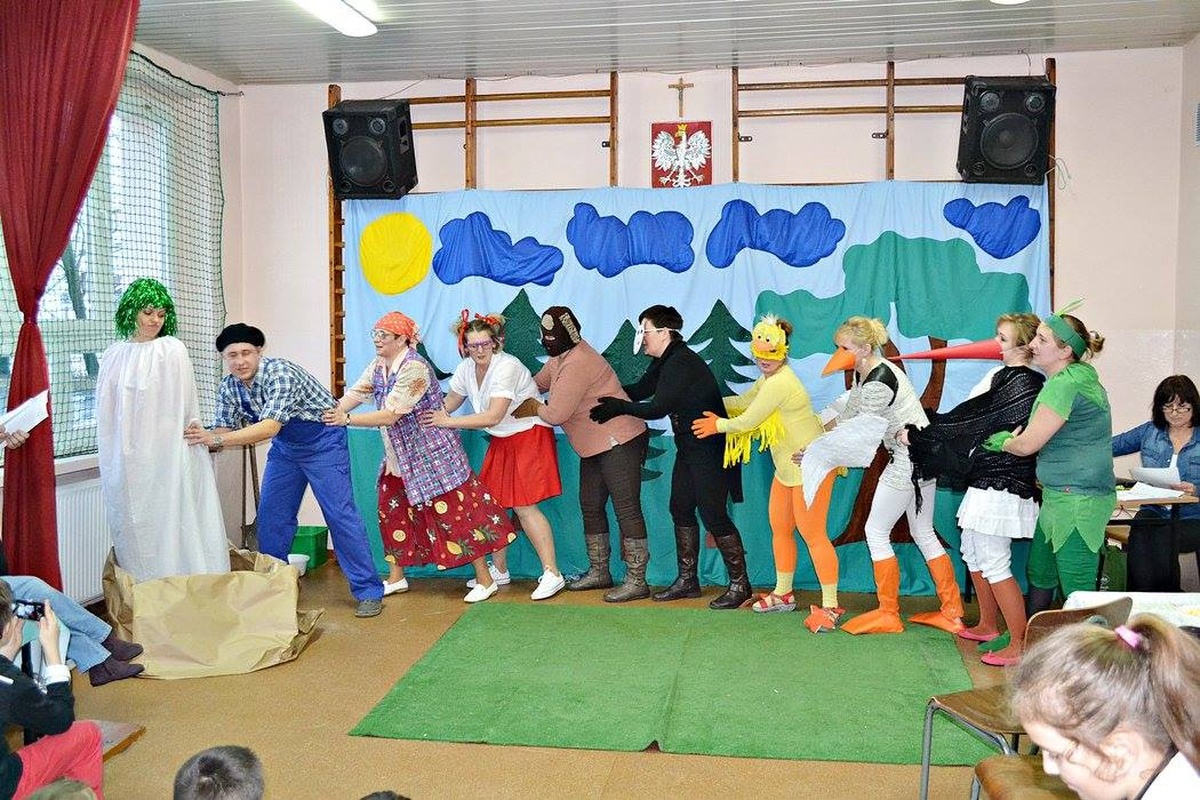 Wychowawczyni Pani Eleonora Palt zaangażowała w świetne przedstawienie również rodziców swoich podopiecznych. Dzieci recytowały wiersze oraz zaśpiewały wspólnie sto lat, a rodzice przedstawili „Rzepkę” Juliana Tuwima nie zapominając przy tym o barwnych przebraniach. W rolę narratora wcieliła się Bernadeta Gonsior.