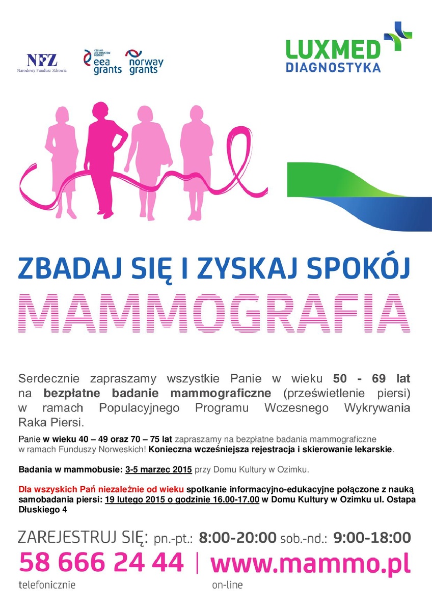 Badania w mammobusie: 3-5 marzec 2015 przy Domu Kultury w Ozimku.