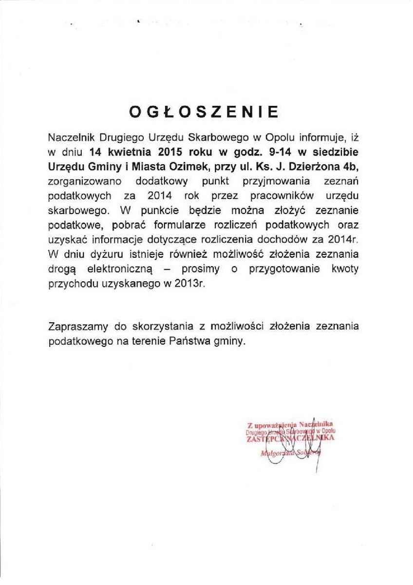 Naczelnik Drugiego Urzędu Skarbowego w Opolu informuje, iż w dniu 14 kwietnia /wtorek/ 2015 roku w godz. 9 - 14 w siedzibie Urzędu Gminy i Miasta Ozimek, przy ul. Ks. Jana Dzierżona 4b, zorganizowano dodatkowy punkt przyjmowania zeznań podatkowych za 2014 rok przez pracowników urzędu skarbowego. W punkcie będzie można złożyć zeznanie podatkowe, pobrać formularze rozliczeń podatkowych oraz uzyskać informacje dotyczące rozliczenia dochodów za 2014 r. W dniu dyżuru istnieje również możliwość złożenia zeznania drogą elektroniczną - prosimy o przygotowanie kwoty przychodu uzyskanego w 2013 r.
