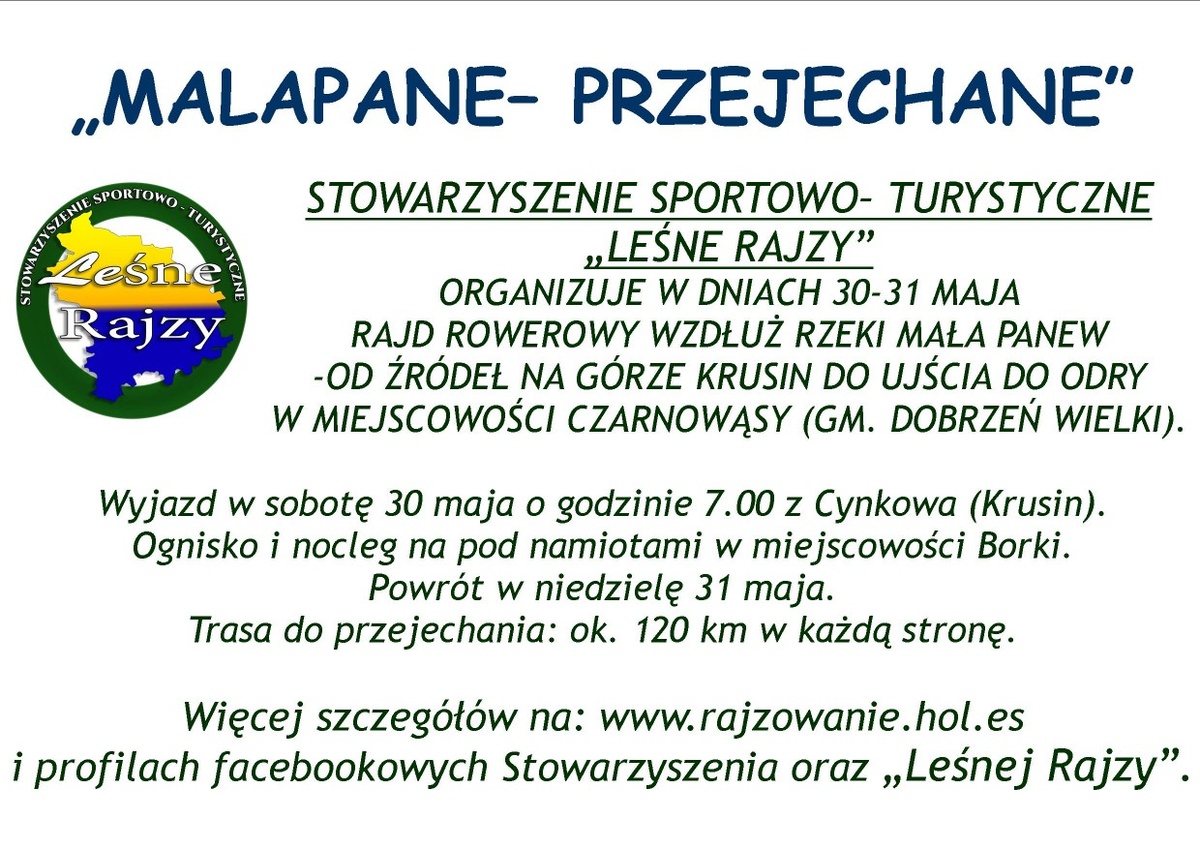 STOWARZYSZENIE SPORTOWO– TURYSTYCZNE „LEŚNE RAJZY” ORGANIZUJE W DNIACH 30-31 MAJA RAJD ROWEROWY WZDŁUŻ RZEKI MAŁA PANEW – OD ŹRÓDEŁ NA GÓRZE KRUSIN DO UJŚCIA DO ODRY W MIEJSCOWOŚCI CZARNOWĄSY (GM. DOBRZEŃ WIELKI). Wyjazd w sobotę 30 maja o godzinie 7.00 z Cynkowa (Krusin). Ognisko i nocleg na campingu pod namiotami w miejscowości Borki. Powrót w niedzielę 31 maja. Trasa do przejechania: ok. 120 km w każdą stronę. Dojazd do Cynkowa (Krusin, okolice ulicy Folwarcznej) – na własną rękę. Bagaże (namioty, plecaki, itp. ) zabrane zostaną w Krusinie do samochodu, który dostarczy je do Borek, następnie w niedzielę odstawi także na Krusin. Istnieje możliwość przejazdu tylko w jedną stronę. W niedzielę ewentualnie powrót busem (rower na przyczepie). Na miejscu ognisko integracyjne. Miejsce biwaku ma węzeł sanitarny. Odpłatność: transport i ewentualnie biwak w Borkach- nie powinna przekroczyć 50 zł od osoby. Rowerzyści jadą na własną odpowiedzialność. Stowarzyszenie nie ubezpiecza uczestników, nie odpowiada też za ewentualne szkody i awarie sprzętu powstałe na trasie rajdu. Zgłoszenia proszę wysyłać na adres mailowy: lesne.rajzy@gmail.com
