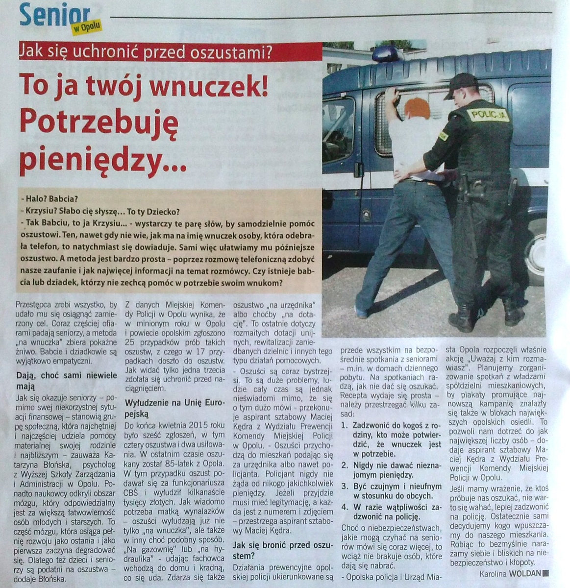 Przestępcy wciąż szukają nowych metod, by oszukać metodą „na wnuczka”. I choć prowadzone przez opolską Policję i środki masowego przekazu na szeroką skalę akcje profilaktyczne przynoszą efekty, wciąż pojawiają się osoby, które dają wiarę oszustom. Niepokojąca jest jednak liczba zgłoszeń dotycząca nowej metody kradzieży „na policjanta, lub na oficera CBŚ”. W ciągu kilku ostatnich dni na terenie Opola i okolic, policjanci odnotowali kilkanaście takich przypadków – niestety kilka osób dało się oszukać i straciło blisko 80 000 złotych. W tych przypadkach sprawcy wykorzystali zaufanie społeczeństwa do funkcjonariuszy Policji i wyłudzili pieniądze od starszych osób.