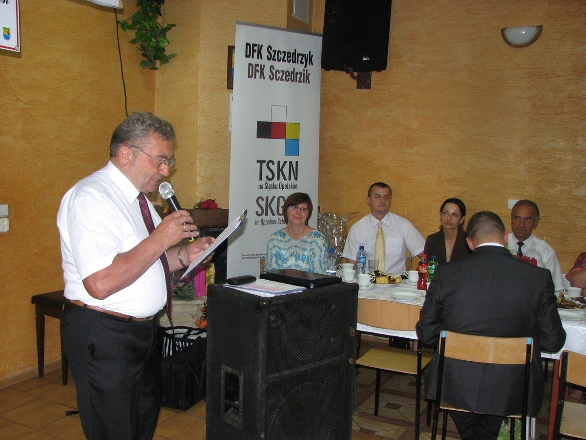 Gratulacje i życzenia dalszej owocnej działalności przekazali na ręce przewodniczącego m.in: w imieniu burmistrza – inspektor ds. promocji gminy Marcin Widera, radny Joachim Wiesbach, sołtys Mirosław Wieszołek, dyrektor Domu Kultury Helena Gruszka oraz przewodniczący działających w Szczedrzyku organizacji. Podczas jubileuszowej biesiady wystąpiła Młodzieżowa Orkiestra Dęta z Chrząstowic, Studio Wokalne „BIS” z Leśnicy oraz solistka Maria Honka z Opola. Wiersze po niemiecku recytowały: uczennica SP w Szczedrzyku Margarethe Szczepaniak oraz Agnieszka Lyp ze Szkoły Podstawowej nr 2 w Ozimku, zdobywczyni pierwszego miejsca w konkursie recytatorskim w języku niemieckim „Młodzież recytuje poezję”. Uroczystości towarzyszyła również wystawa fotograficzna obrazująca 25-letnią działalność Koła DFK Szczedrzyk-Pustków.