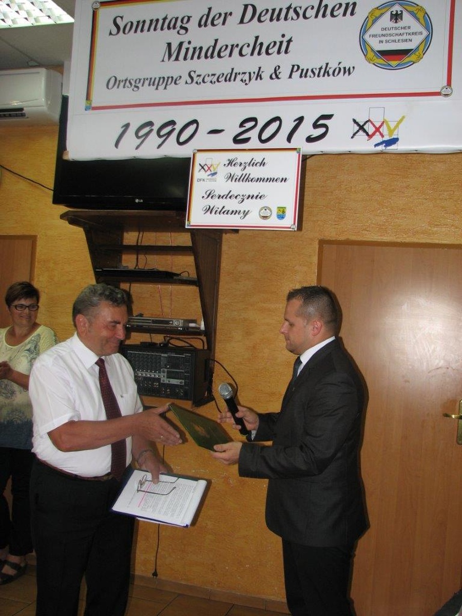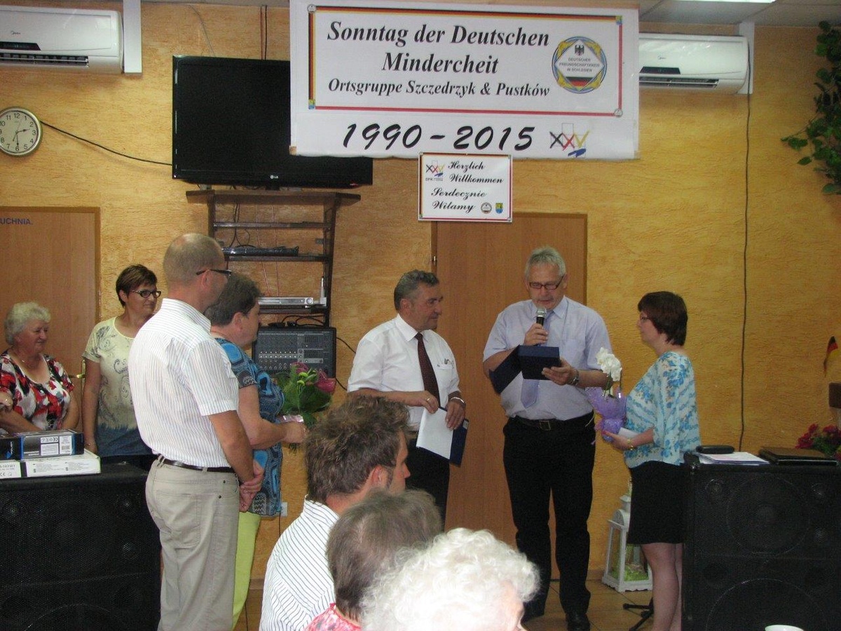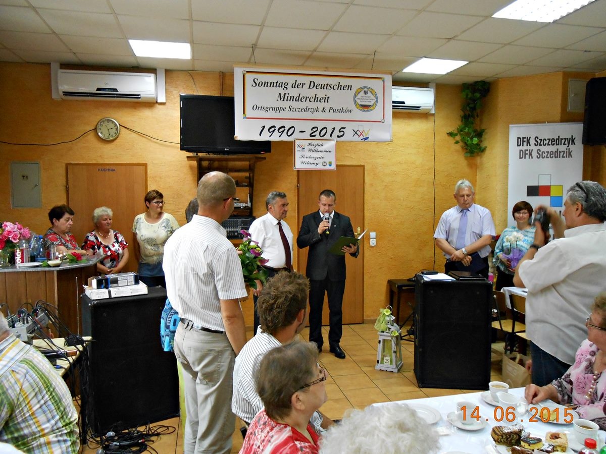 Niezwykle uroczysty charakter miała tegoroczna Niedziela Mniejszości Niemieckiej w Szczedrzyku. 14 czerwca obchodzono bowiem jubileusz 25-lecia działalności Koła DFK Szczedrzyk-Pustków. Z tej okazji, rano w kościele parafialnym odprawiona została msza święta w imieniu zmarłych i żyjących członków Koła. a po południu w świetlicy wiejskiej odbyła się jubileuszowa uroczystość oraz biesiada, na którą zaproszono wszystkich członków Mniejszości Niemieckiej ze Szczedrzyka i Pustkowa oraz liczne grono gości. Przygotowano również bogaty program artystyczny.