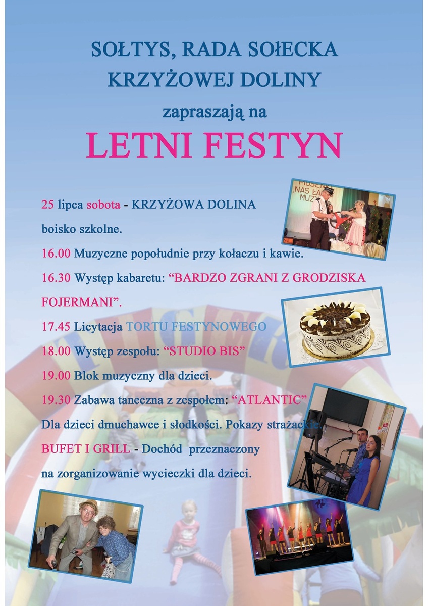 Sołtys oraz Rada Sołecka Krzyżowej Doliny serdecznie zapraszają na LETNI FESTYN, który odbędzie się 25 lipca 2015 r. na boisku szkolnym. W programie „Bardzo Zgrani z Grodziska Fojermani” i „Studio BIS”, jak również wiele innych atrakcji. Wieczorem zaś czeka zabawa taneczna z zespołem „Atlantic”. Więcej na plakacie.