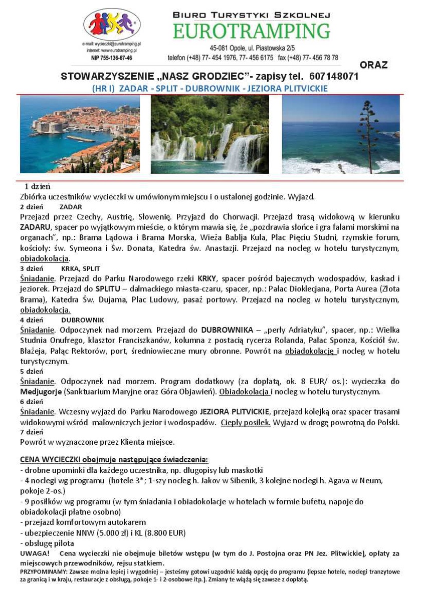 Stowarzyszenie Nasz Grodziec i Biuro Turystyki Szkolnej Eurotramping zapraszają na wycieczkę do Chorwacji.