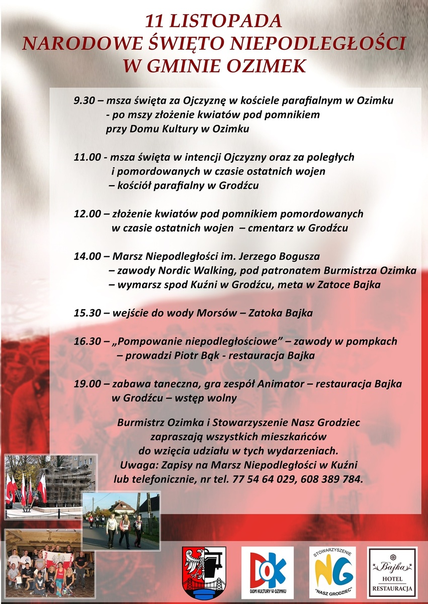 14.00 – Marsz Niepodległości im. Jerzego Bogusza – zawody Nordic Walking, pod patronatem Burmistrza Ozimka – wymarsz spod Kuźni w Grodźcu, meta w Zatoce Bajka;