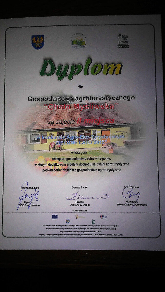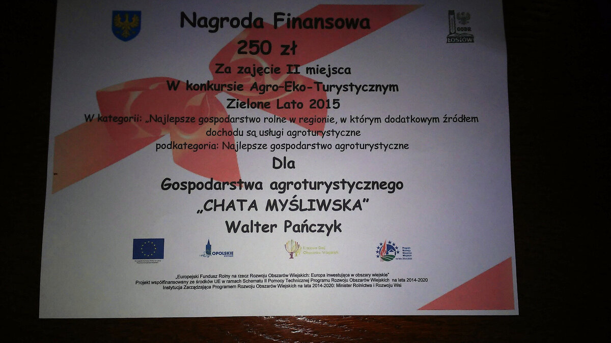 18 listopada 2015 r. w Polskiej Nowej Wsi odbyła się konferencja podsumowująca konkurs Agro – Eko – Turystyczny „Zielone Lato 2015”, na której nagrodzono II miejscem gospodarstwo agroturystyczne „CHATA MYŚLIWSKA” Pana Waltera Pańczyka z Krasiejowa w kategorii „Najlepsze gospodarstwo rolne w regionie, w którym dodatkowym źródłem dochodu są usługi agroturystyczne”. Do licznych gratulacji dołączył Burmistrz Ozimka Jan Labus, który również ufundował nagrodę.