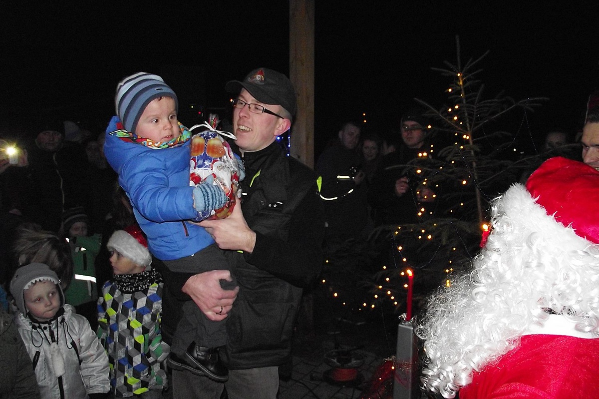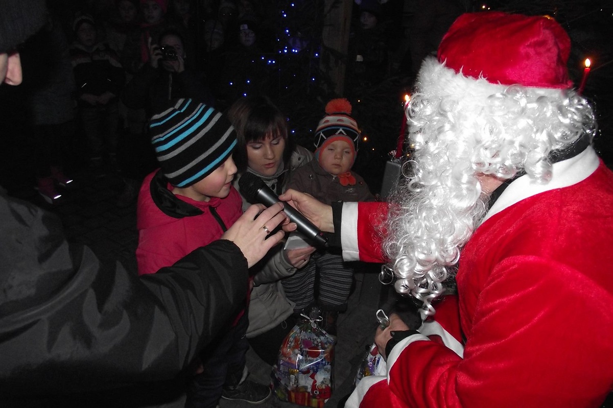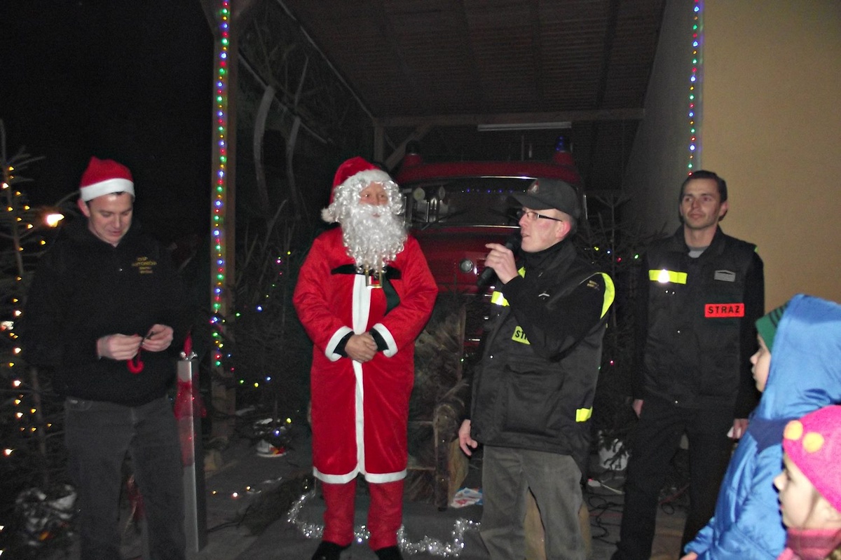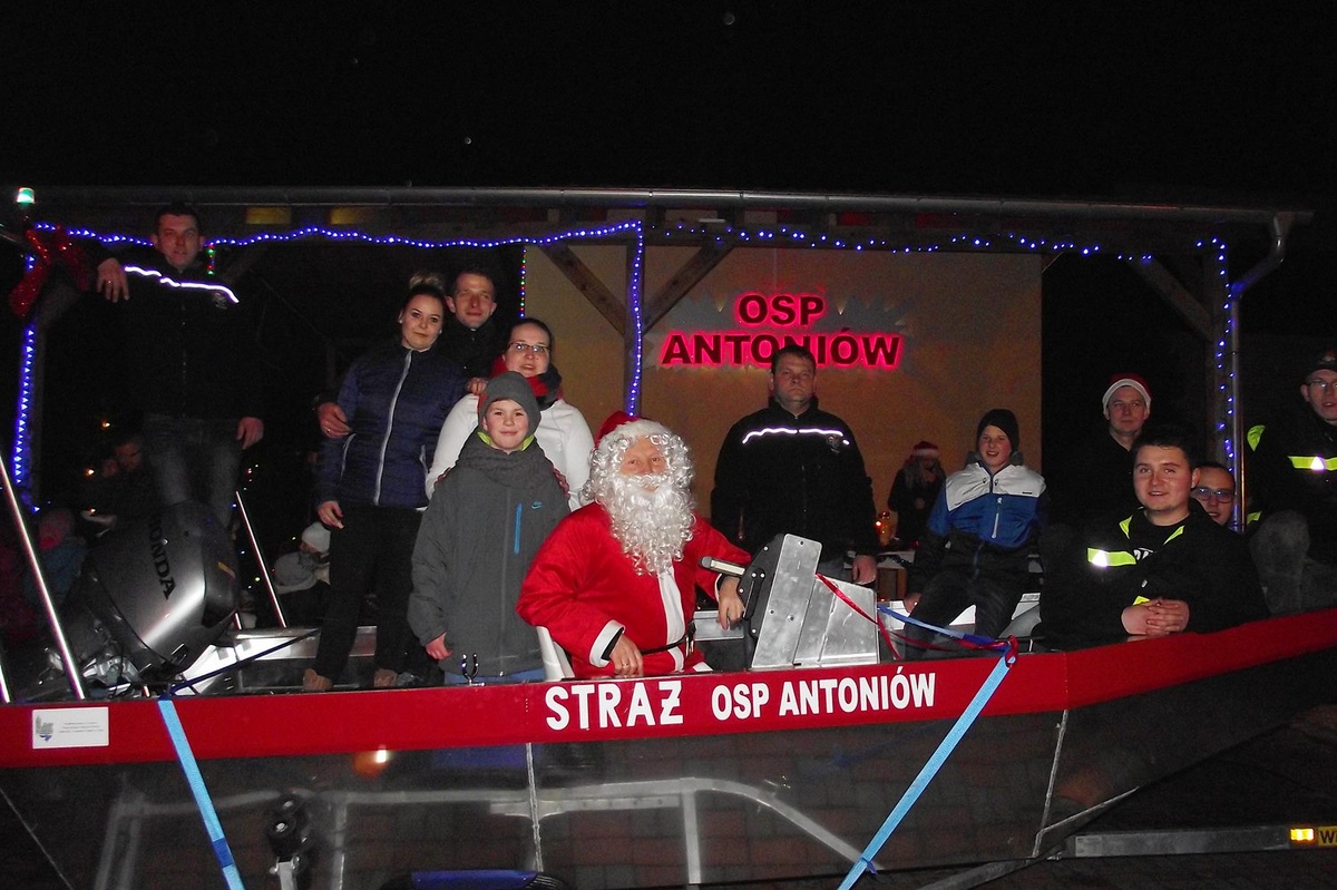 Podobnie jak w ubiegłym roku spotkanie ze świętym Mikołajem zorganizowano na placu za remizą OSP. Szczególną atrakcja było, że Mikołaj przybył na łodzi, którą ciągnął za sobą wóz strażacki.