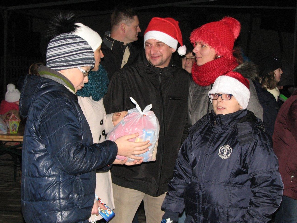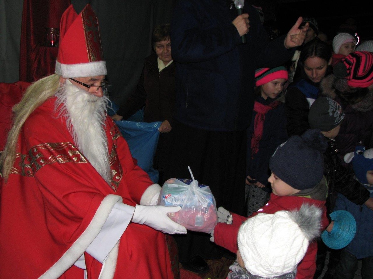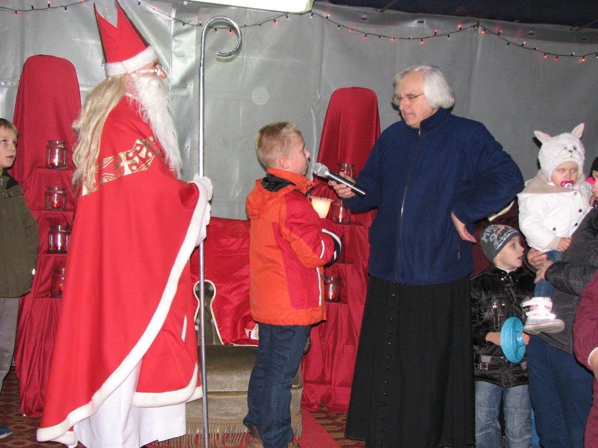 Po wieczornej mszy świętej dzieci wraz z rodzicami przybyły na miejsce spotkania, przyprowadzone przez proboszcza ks. prałata Marcina Ogioldę. Mikołaj przyjechał na plac zabytkowym samochodem. Zanim zaczął rozdawać prezenty, zadał dzieciom kilka pytań, sprawdzając ich wiedzę o patronie szczedrzyckiej parafii. Zaczynając od najmłodszych dzieci, a kończąc na młodzieży, rozdał ponad dwieście paczek ze słodyczami. Na adwentowym kiermaszu panie z Caritas sprzedawały własnoręcznie zrobione pierniki, makarony, pasztety i inne domowe przetwory. Dochód z kiermaszu i zebranych w trakcie imprezy wolnych datków przeznaczany jest na działalność charytatywną – pomoc osobom chorym, starym i samotnym z całej parafii Szczedrzyk.