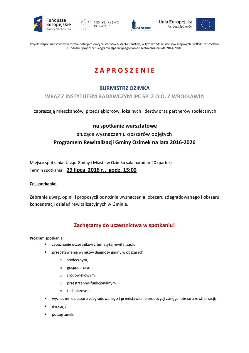 Program Rewitalizacji Gminy Ozimek na lata 2016-2026 - Zaproszenie na I spotkanie warsztatowe