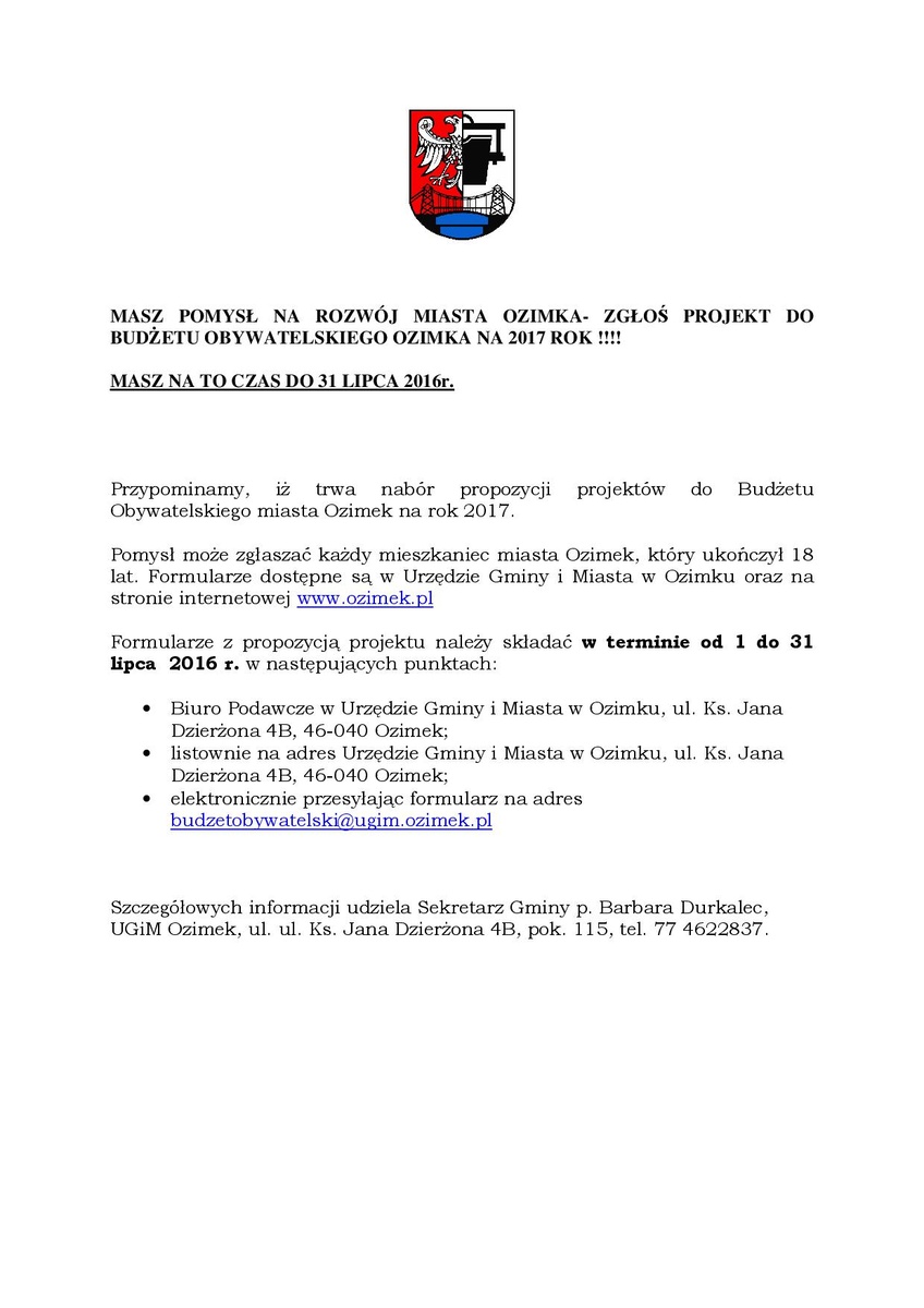 MASZ POMYSŁ NA ROZWÓJ MIASTA OZIMKA- ZGŁOŚ PROJEKT DO BUDŻETU OBYWATELSKIEGO OZIMKA NA 2017 ROK !!!!