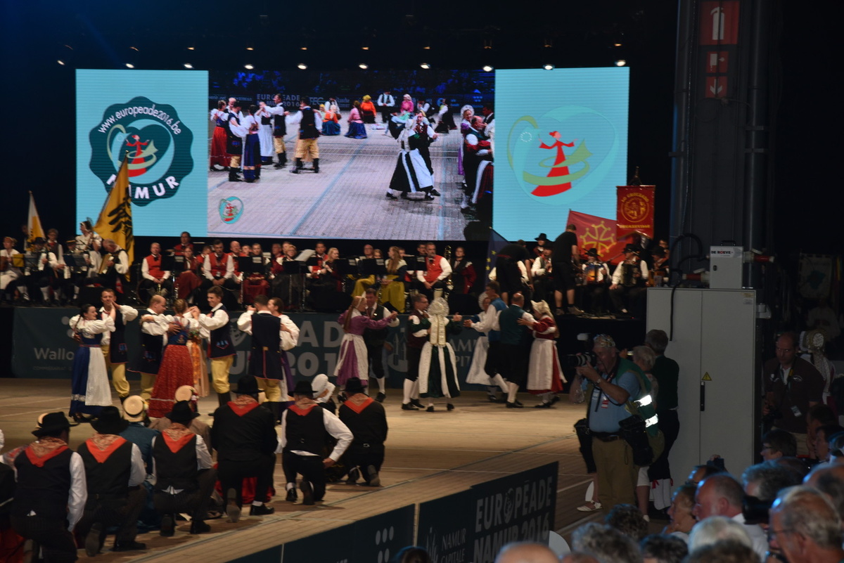 Popołudniu wzięliśmy udział w barwnej paradzie wszystkich zespołów. Pomimo deszczu, humory wszystkim dopisywały a licznie zgromadzona publiczność gromkimi brawami i okrzykami MERCI wyrażała swój zachwyt i zadowolenie. Następnie zmęczeni i zmoknięci udaliśmy się na Bal Europy, gdzie świetna muzyka, wspaniała atmosfera i zabawa nam to zrekompensowała. Po bardzo krótkiej nocy w niedzielę przygotowywaliśmy się do najważniejszego występu – w Hali Expo Namur, punktualnie o godz. 15.00 rozpoczął się uroczysty Koncert Galowy Regionów Europy, który był na żywo emitowany we wszystkich belgijskich programach telewizyjnych oraz w Internecie. Region Śląsk miał swój występ ok. godz. 16.00 – 48 tancerek i tancerzy tańczyło wspólną choreografię – a my wraz z nimi. Dlatego też obok naszych pięknych opolskich strojów reprezentowane były stroje dolnośląskie i bielskie. Występ wypadł wyśmienicie. Po pięknym występie mogliśmy wreszcie rozkoszować się pozostałymi występami a później wspólnie z innymi uczestnikami bawić się na – w tym dniu chyba największej w Europie – zabawie tanecznej. Późnym wieczorem wraz z naszymi przyjaciółmi i nowo poznanymi zespołami siedzieliśmy przy wspólnym stole ciesząc się efektami i przeżyciami ostatnich dni oraz planując już następny wyjazd na Europeade w 2017 roku, która będzie miała miejsce w Turku w Finlandii. Po północy pożegnaliśmy wszystkich, łzy były nie do opanowania.