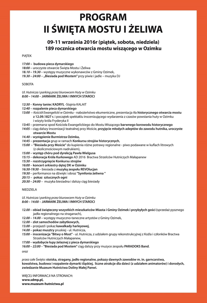 Już w piątek (09.09.2016 r.) o godz. 17:00 na widzów czeka budowa pieca dymarskiego, po której nastąpi otwarcie Święta Mostu i Żeliwa. Następnie w programie zaplanowano liczne występy muzyczne wykonawców z gminy Ozimek oraz „Biesiadę pod Mostem” z muzyką DJ.