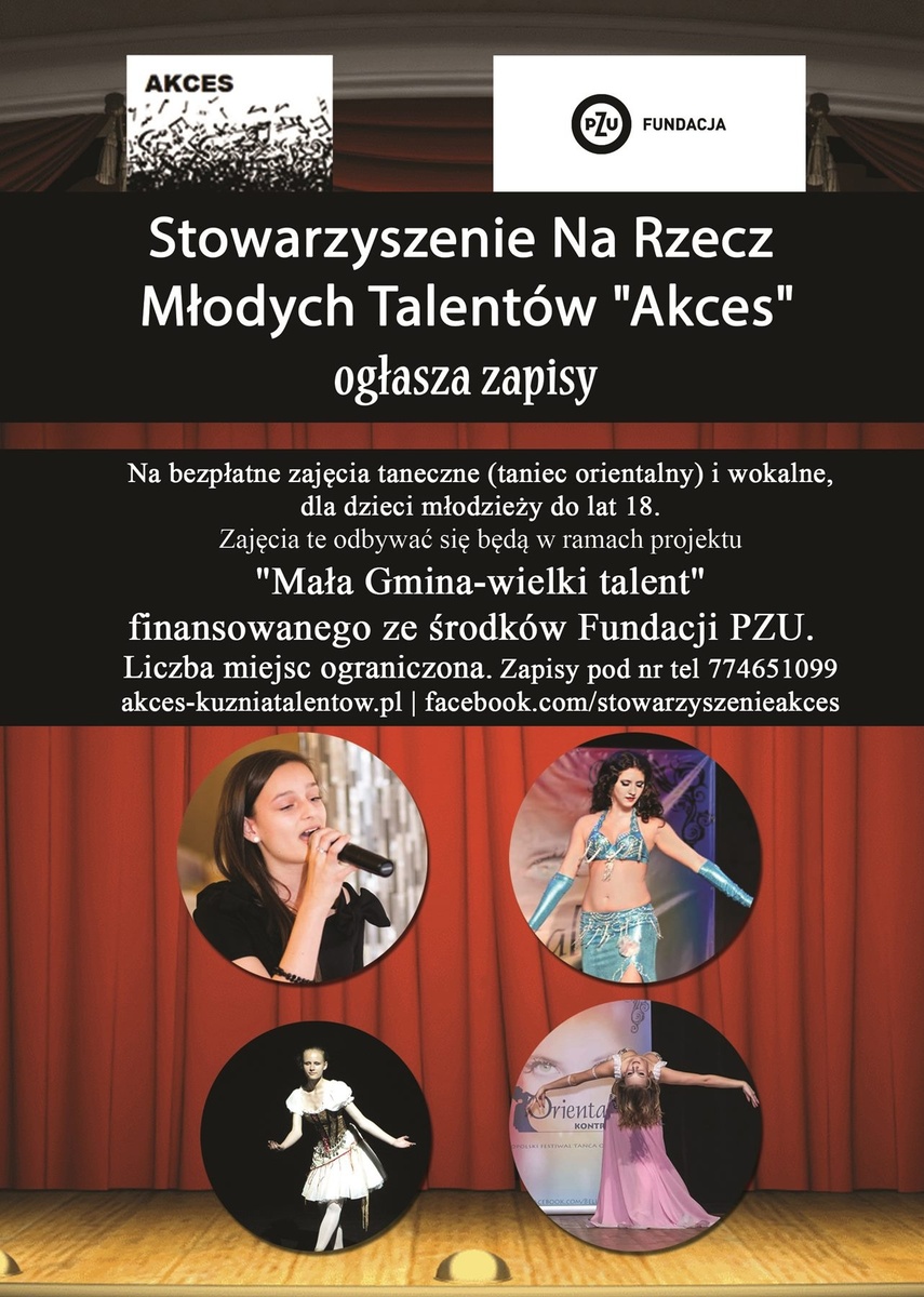 Stowarzyszenie Na Rzecz Młodych Talentów ogłasza zapisy na bezpłatne zajęcia taneczne (taniec orientalny) dla dzieci i młodzieży do lat 18. Zajęcia odbywać się będą w ramach projektu „Mała Gmina - wielki talent” finansowanego ze środków fundacji PZU.