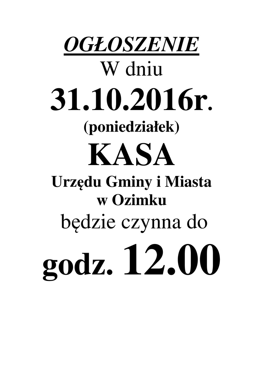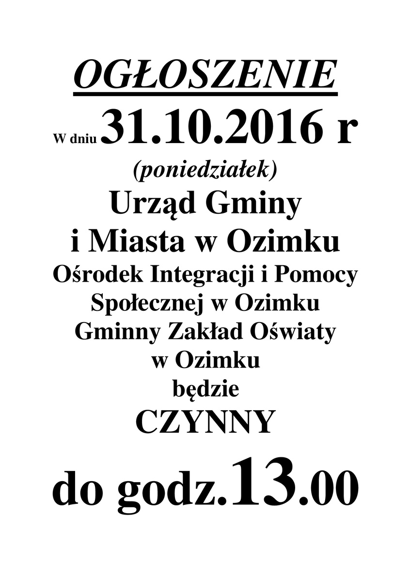 W dniu 31.10.2016 r (poniedziałek) Urząd Gminy i Miasta w Ozimku Ośrodek Integracji i Pomocy Społecznej w Ozimku Gminny Zakład Oświaty w Ozimku będzie CZYNNY do godz. 13.00.