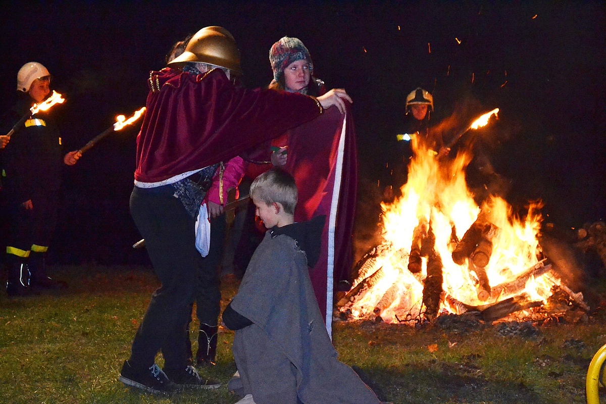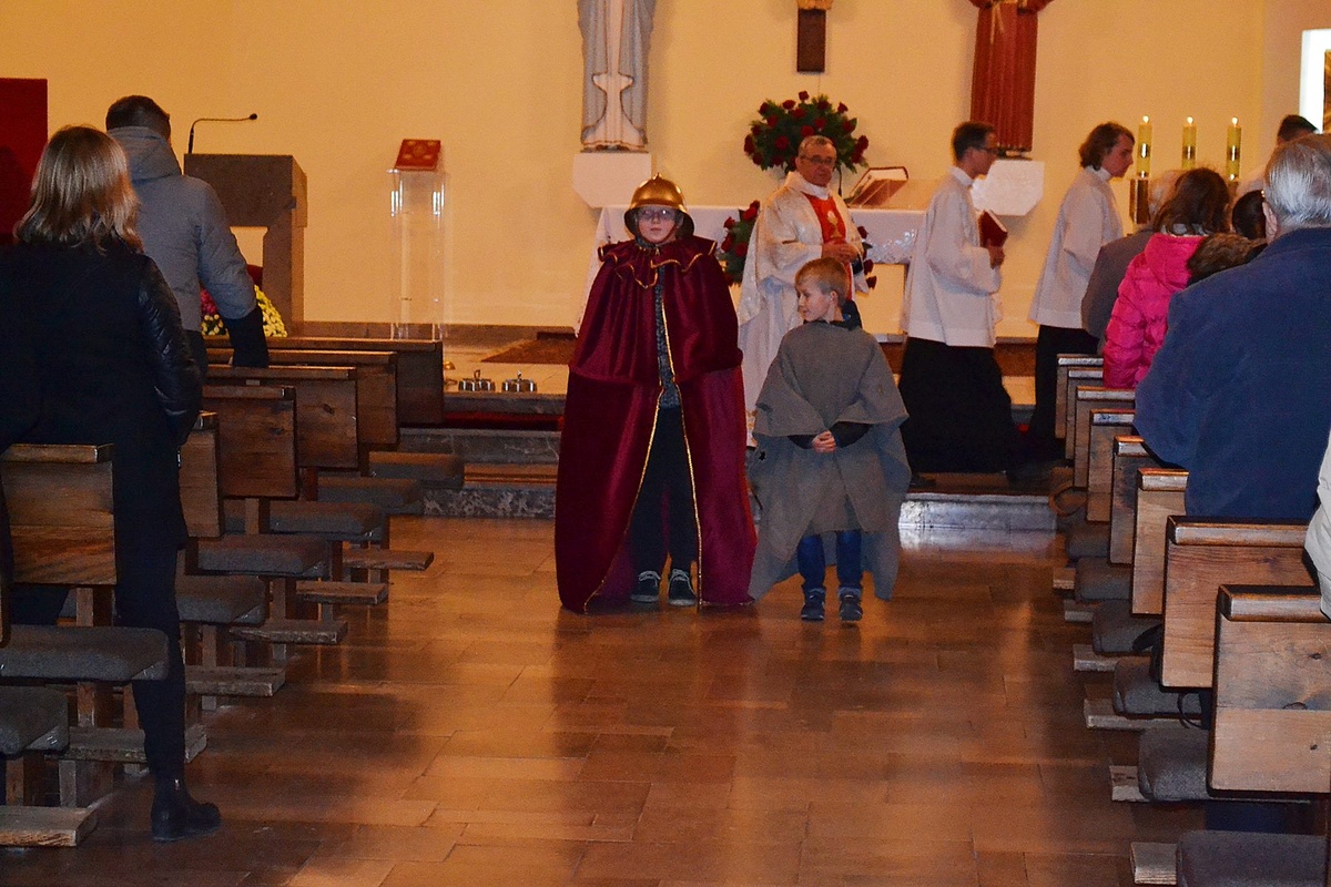 Gdy już wszyscy się zebrali młodzi aktorzy, którzy wcielili się w role: św. Marcina (Manuel Widera), żebraka (Florian Klimas) i narratorów (Ola Rzepka i Manuela Kurpiers) przedstawili scenkę, w której św. Marcin zgodnie z legendą podzielił się płaszczem z żebrakiem – co ma symbolizować wielkie miłosierdzie. Przygotowała ich Anna Spyra (nauczyciel SP 2 w Ozimku).