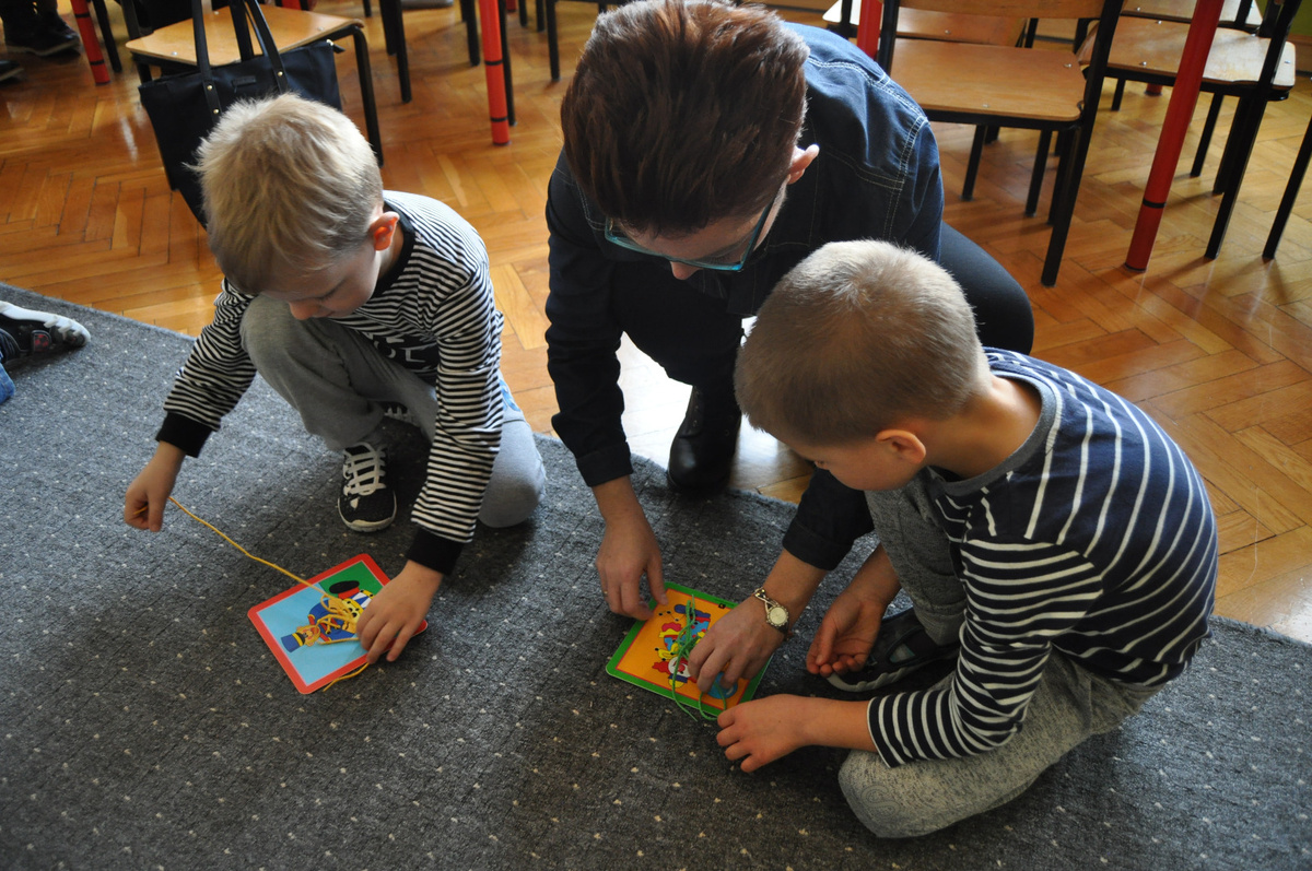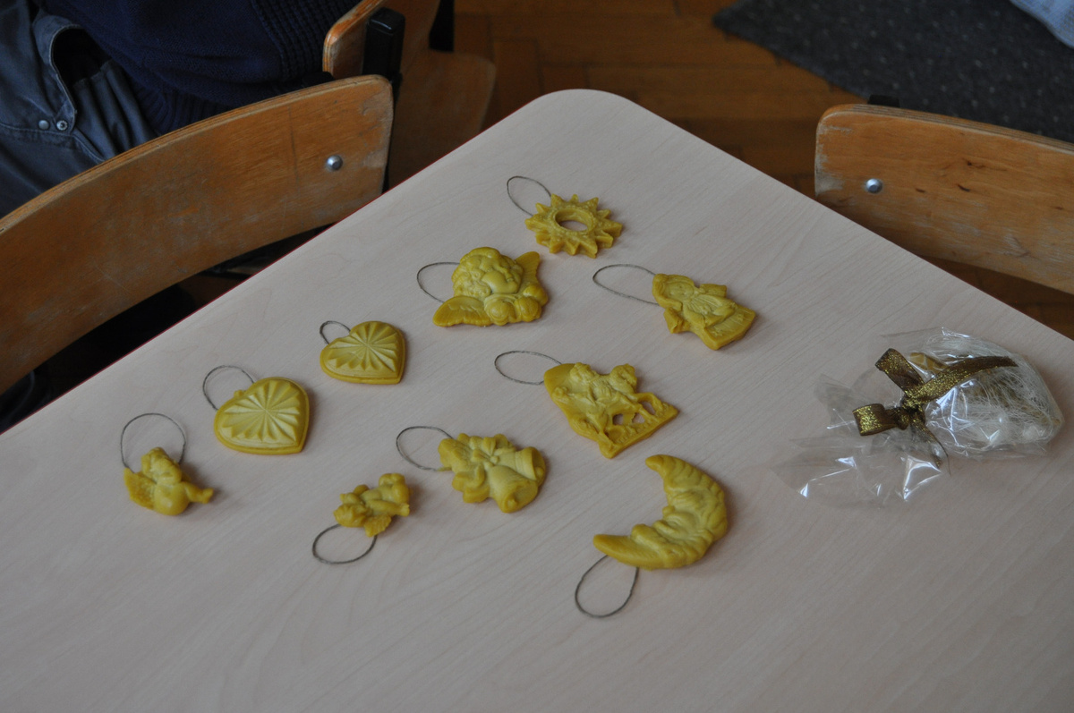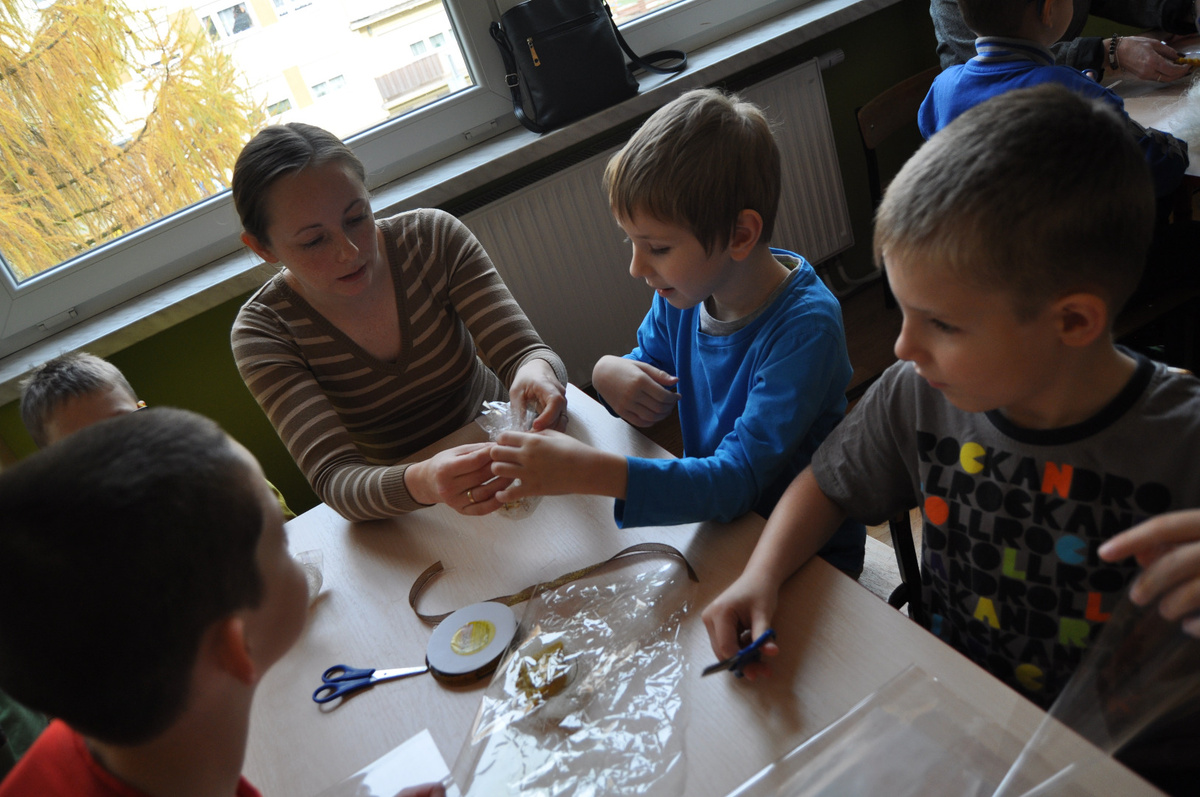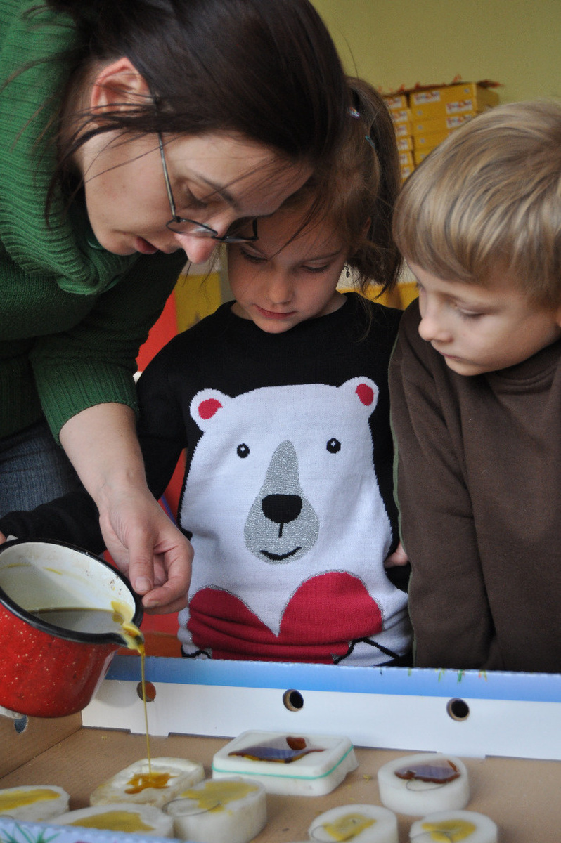 Zbliżają się Święta Bożego Narodzenia, to magiczny czas, kiedy chętnie kupujemy ozdoby do naszych domów. Postanowiliśmy więc wykonać piękne odlewy z naturalnego, aromatycznego wosku pszczelego i estetycznie je zapakować . Rozpoczęliśmy od nauki wiązania kokardek. Dzieci wraz z opiekunami szukały technik najpiękniejszego wiązania tasiemek (trenowaliśmy na sznurowadłach). Pięknie zawiązane miały zwieńczyć nasze dzieło. Następnie podzieliliśmy prace i z uśmiechem zabraliśmy się do: nalewania wosku w foremki, cięcia celofanu, układania „gniazdek” z rafii, pakowania ozdób i dekorowania ich kolorowymi kokardkami. W efekcie naszych starań powstały figurki, z których każda jest wyjątkowa, zrobiona z sercem i pełnym zaangażowaniem.