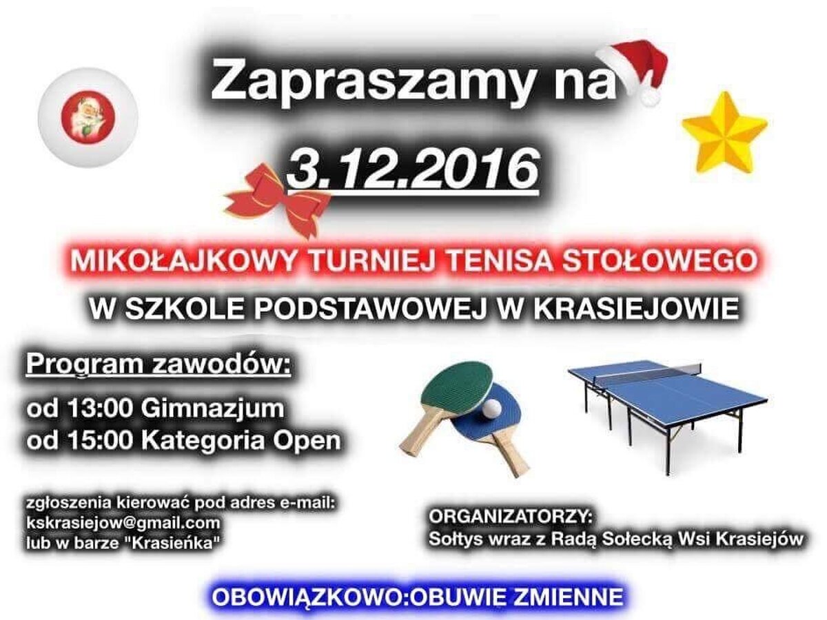Sołtys wraz z Radą Sołecką Wsi Krasiejów zapraszają na Mikołajkowy Turniej Tenisa Stołowego, który odbędzie się w sobotę 3 grudnia 2016 r. w Szkole Podstawowej w Krasiejowie.