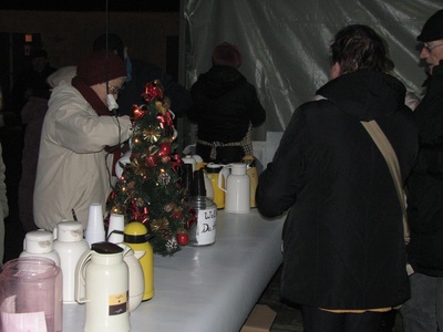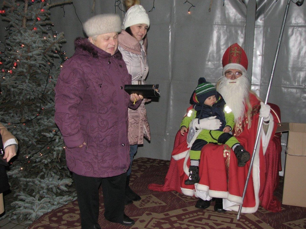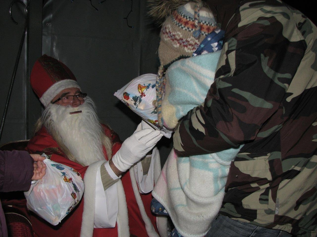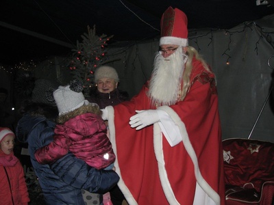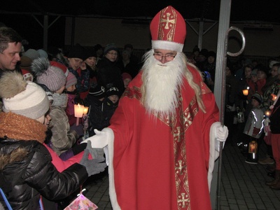 W tym roku, z powodu braku śniegu, Mikołaj przyjechał na miejsce spotkania zabytkowym samochodem. Towarzyszyły mu dzieci z lampionami, które po mszy świętej przyprowadził ze śpiewem proboszcz ks. prałat Marcin Ogiolda. Na miejscu panie z Caritas czekały już ze świątecznym kiermaszem, a chętni mogli posilić się kiełbasą z rożna, rozgrzać gorącą herbatą, grzanym winem (tylko dorośli) lub ciepłem z ogniska. Mikołaj miał pełne ręce roboty, bowiem w kilkanaście minut rozdał ponad 200 paczek, którymi obdarowane zostały wszystkie przybyłe dzieci – od najmłodszych aż po gimnazjalistów. Rodzice chętnie korzystali też z okazji, by zrobić pamiątkowe zdjęcie swojej pociechy z Mikołajem.