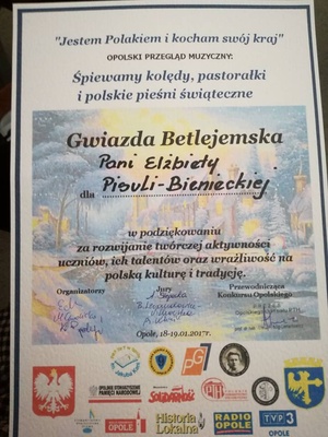 Blisko 500. uczestników Opolskiego Przeglądu Muzycznego zaśpiewało najpiękniejsze kolędy, pastorałki i polskie pieśni świątecznej podczas Opolskiego Przeglądu Muzycznego . W udziale naszym dwóm zespołom- duetowi "Nutki" (Kasia Kierpal i Zosia Kała)-kategoria szkoły podstawowe oraz zespołowi gimnazjalnemu"My" (Maja Czerepaniak, Natalia Nowak, Maja Pierwoła oraz Ola Stryczek) przypadły wyróżnienia. Wyróżnienia te stanowią wg regulaminu konkursu, pierwsze nagrody, zaś najwyższe specjalne wyróżnienie, jedno w każdej kategorii-Gwiazdę Betlejemską wyśpiewała Maja Pierwoła-, która pastorałką "Cicho, cicho pastuszkowie zachwyciła I wzruszyła jury. Dodatkową Gwiazdą Betlejemską, w podziękowaniu za rozwijanie twórczej aktywności uczniów, ich talentów oraz wrażliwości na polska kulturę i tradycję, została nagrodzona opiekunka zespołów i solistki, nauczyciel muzyki w GZS w Ozimku-Pani Elżbieta Pisula-Bieniecka.
