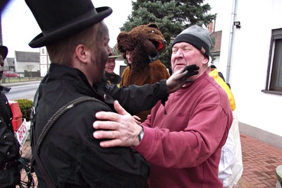 Wśród barwnego orszaku byli m.in. lekarz, proboszcz, policjant, cyganka oraz kominiarz. Najważniejszą postacią jest naturalnie Ber – Niedźwiedź, który symbolizuje zło. Prowadzony przez „fejśtra” na łańcuchu tańczy w każdym domostwie z gospodynią domu, co wróży szczęściem w całym roku. Ponadto policjanci wręczali kierowcom mandaty, ksiądz spowiadał i błogosławił, a lekarze sprawdzali stan zdrowia mieszkańców.