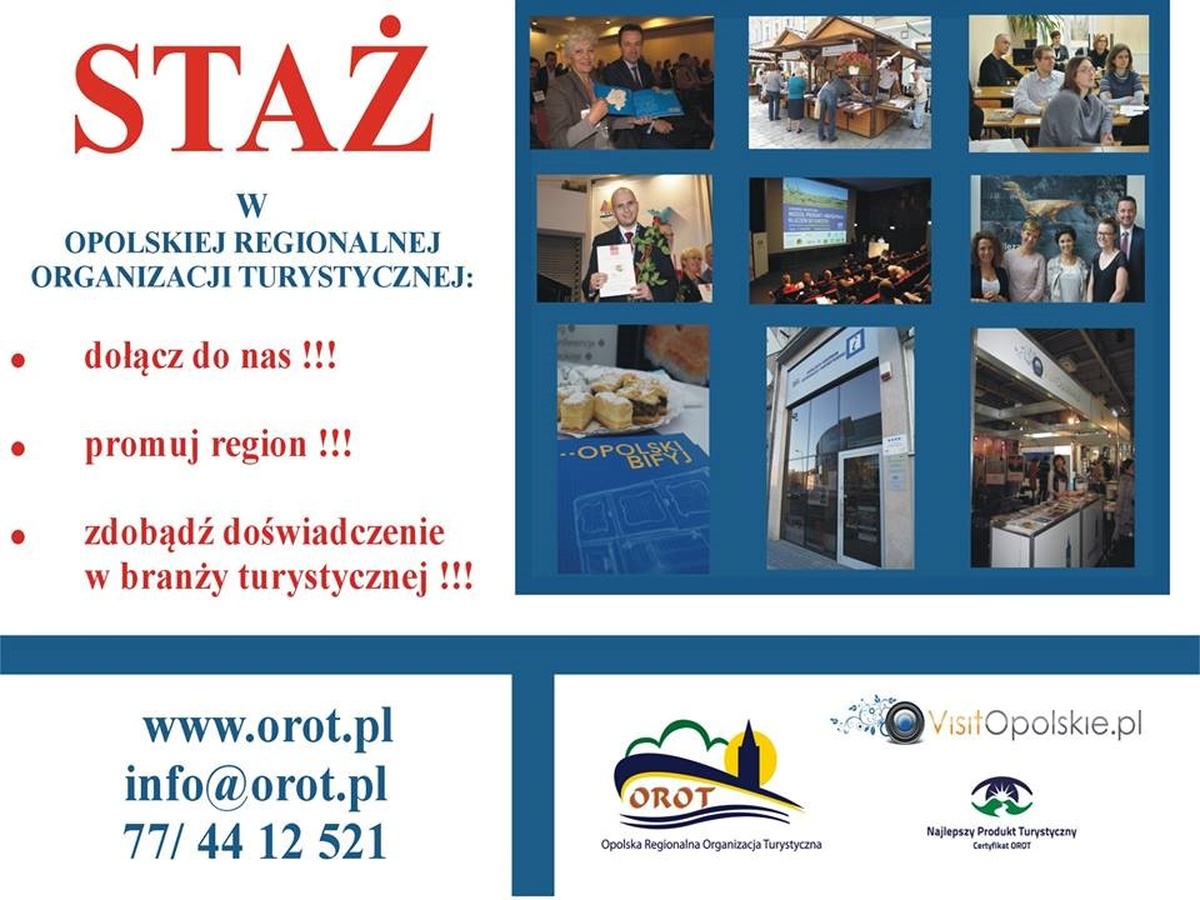 Uprzejmie informujemy , iż jest możliwość odbycia stażu w Opolskiej Regionalnej Organizacji Turystycznej, wszystkie potrzebne informacje otrzymają Państwo pod nr telefonu (77) 44 12 521.