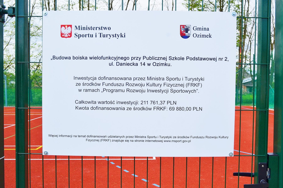 Boisko powstało w ramach inwestycji pn. „Budowa boiska wielofunkcyjnego przy Publicznej Szkole Podstawowej nr 2, ul. Daniecka 14 w Ozimku.”