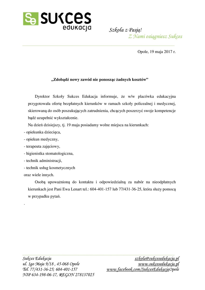 Dyrektor Szkoły Sukces Edukacja informuje, że w/w placówka edukacyjna przygotowała ofertę bezpłatnych kierunków w ramach szkoły policealnej i medycznej, skierowaną do osób poszukujących zatrudnienia, chcących poszerzyć swoje kompetencje bądź uzupełnić wykształcenie.