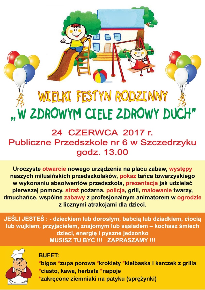 Publiczne Przedszkole nr 6 w Szczedrzyku zaprasza na Wielki Festyn Rodzinny – „W zdrowym ciele zdrowy duch”, który odbędzie się 24 czerwca 2017 r. o godz. 13:00.