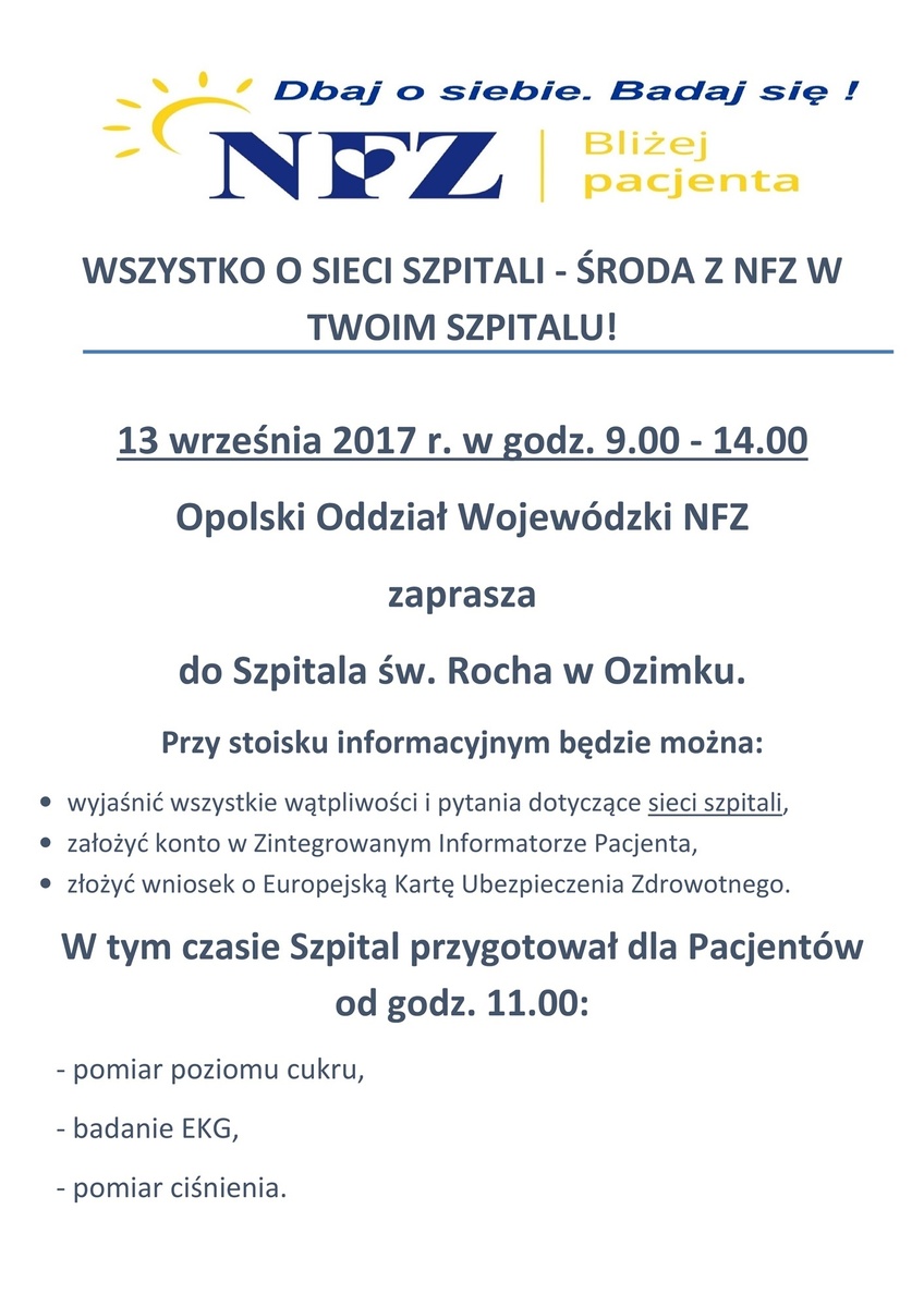 Biorąc udział w ogólnopolskiej kampanii informacyjnej pracownicy Opolskiego Oddziału Wojewódzkiego NFZ w każdą środę września, w jednym z opolskich szpitali, będą odpowiadać na wszystkie pytania pacjentów związane z systemem podstawowego szpitalnego zabezpieczenia świadczeń.