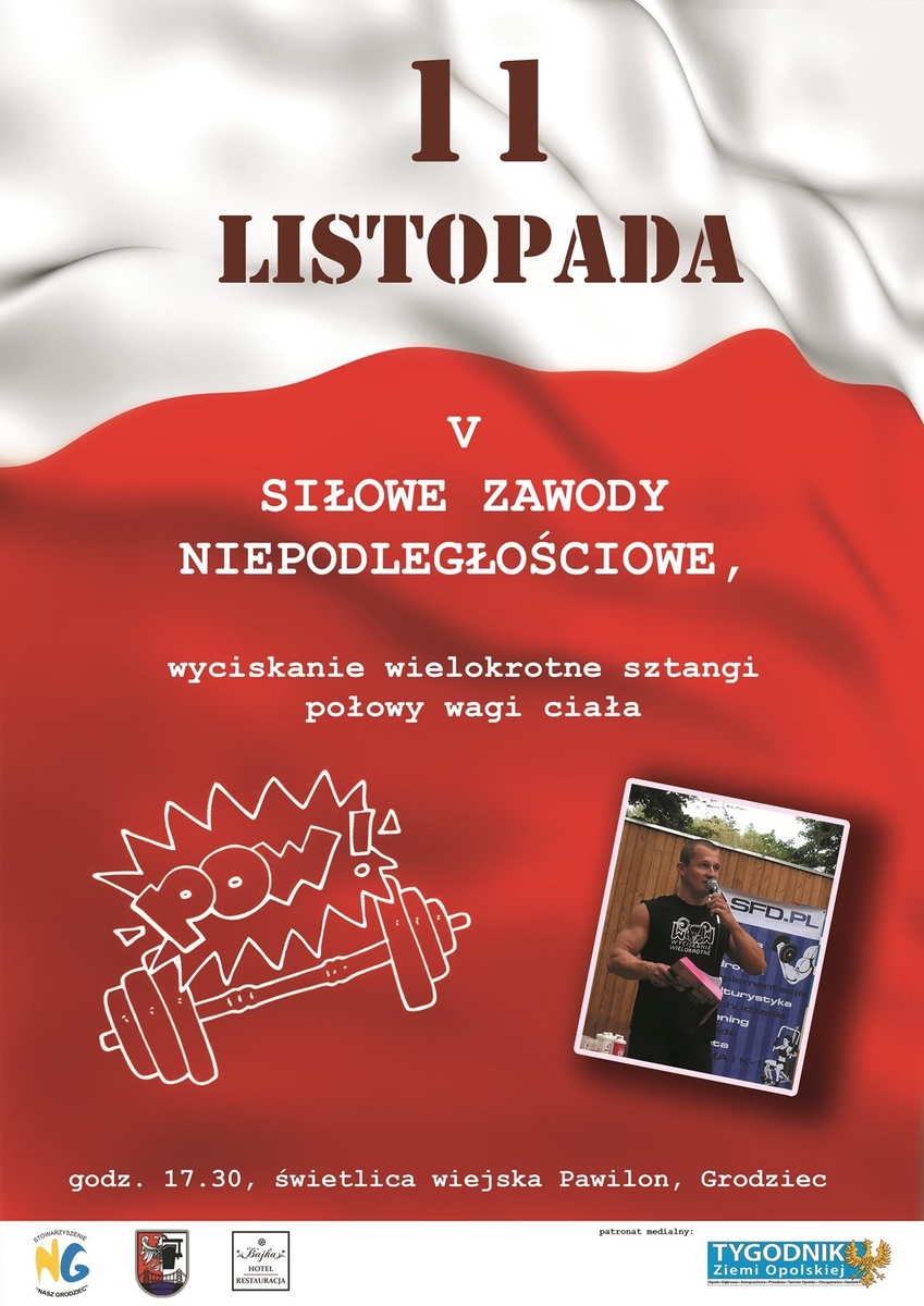 17.30 – „Wyciskanie niepodległościowe” – zawody w wyciskaniu wielokrotnym sztangi – świetlica wiejska pawilon;