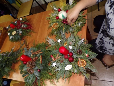 Szkolenie prowadziła florystka Teresa Machnik-Spyra, która przygotowała materiały, pokazała bezpieczną obsługę narzędzi oraz służyła dobrą radą przy kompozycjach. Podczas intensywnej pracy powstawały nie tylko wyjątkowe kreacje oraz „małe dzieła”, ale przede wszystkim uczestnicy mogli wymienić się doświadczeniami. Starsi opowiadali młodemu pokoleniu jak dawniej wyglądały święta, jakie były tradycje oraz jakie ciekawe historie im się przytrafiły.