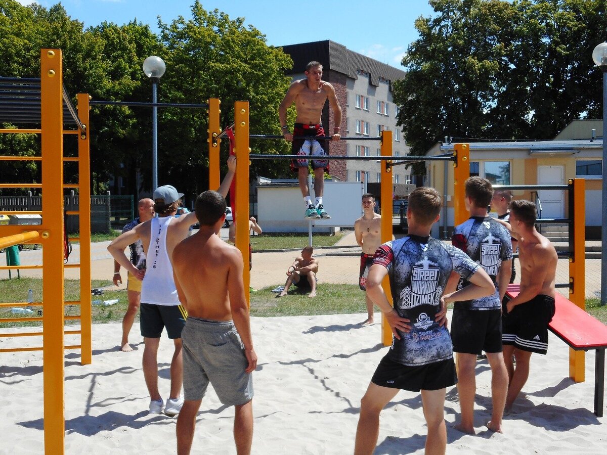 Wracając do otwarcia obiektu. Od krótkiego przemówienia rozpoczęli Burmistrz Ozimka Jan Labus oraz zarząd stowarzyszenia Active Team w osobach Joanna Bachłaj i Iwona Wiercińska, które wspiera wszelkie działania w kierunku aktywizacji ozimskiej społeczności. Zaproszeni oficjele na ręce lidera grupy Streetworkout Ozimek Rafała Jurczyńskiego wręczyli drobne upominki w postaci sprzętu sportowego, który będzie pomagał w treningach wszystkim, którzy będą mieli ochotę ćwiczyć na naszym parku, po czym nastąpiło symboliczne przecięcie wstęgi. Kolejnym punktem w programie były warsztaty z kalisteniki dla wszystkich, którzy chcieliby rozpocząć swoją przygodę ćwicząc z obciążeniem własnego ciała bądź już ćwiczą, ale chcieliby podszkolić swoją wiedzę i doszlifować technikę. Tą częścią imprezy zajęli się profesjonaliści z Dynasty Workout na czele z Jarosławem Bulla Calistenics. Panowie pokazali jak prawidłowo przeprowadzić rozgrzewkę do tego typu obciążeń i wtajemniczyli, na co zwracać uwagę by ćwiczenia na drążku były bezpieczne i bezkontuzyjne. Następnie przyszedł czas na przerywnik w postaci poczęstunku z grilla, po którym uczestnicy warsztatów przeszli do treningu właściwego. W tej części imprezy prowadzący warsztaty przekazali wiedzę jak nauczyć się poprawnie wykonywać podstawowe figury w Streetworkout-cie. Mamy nadzieję, że zdobyta podczas warsztatów wiedza zaowocuje i w niedalekiej przyszłości mieszkańcy Ozimka będą mieli okazję kibicować komuś z Streetworkout Ozimek podczas zawodów rangi krajowej a może nawet międzynarodowej.