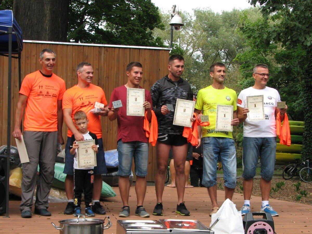 W tym roku na starcie stanęło 31 par, w tym kilka mieszanych i jedna kobieca, która jednak nie dopłynęła do mety. Najlepsza załoga dotarła do przystani kajakowej na Wyspie Rehdanz’a w czasie 5:53:47, o 3 minuty lepszym od ubiegłorocznego rekordu. Zwycięzcami VI Triatlonu Turystycznego zostali „Nordikowcy” – Piotr Siwak z Rudnej i Ireneusz Lubiatowski z Gubina. Jako drugi, z czasem 6:03:22, do mety dopłynął team „Maximus” – Krzysztof Fuhl Jemielnicy i Piotr Muszkiet z Kolonowskiego, a wrocławsko-ozimski duet „Gruby i Chudy” – Krzysztof Wierny i Szymon Stręk zameldował się na mecie trzeci, z czasem 6:05:40. Na premiowanych nagrodami miejscach uplasowali się również: 4. „Malapane Team” – Krzysztof Nalepa i Marceli Biskup z Ozimka (6;07:42), 5. „Madej&Madej” – Anna Madej i Sergiusz Madej z Katowic (6:13:31), 6. „Trek Merida Ozimek” – Tomasz Wiśniewski i Rafał Starzec z Ozimka (6:19:21). Na mecie czekał na zawodników posiłek oraz nagrody, które wręczał prezes SDMP Józef Tomasz Juros z pomysłodawcą i głównym organizatorem triatlonu Romanem Jarosińskim. Poza dyplomami i nagrodami dla sześciu najlepszych par, wszyscy otrzymali pamiątkowe koszulki, statuetki i certyfikaty ukończenia VI Triatlonu Turystycznego.