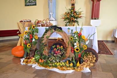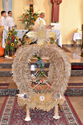 Dożynki rozpoczęły się uroczystą dziękczynną mszą św. w kościele parafialnym p.w. Matki Boskiej Różańcowej w Schodni. Szczególne wrażenie na parafianach zrobiła przepiękna korona oraz dożynkowy wystrój kościoła. To już tradycja, że podczas ofiary każdy uczestnik mszy otrzymuje symboliczny bochenek chleba z tegorocznych plonów.