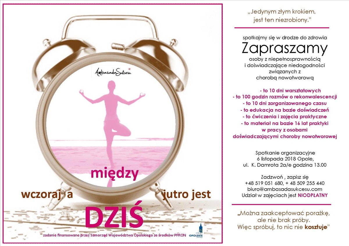 Stowarzyszenie Ambasada Sukcesu zaprasza osoby z niepełnosprawnością i doświadczające niedogodności związanych z chorobą nowotworową na spotkanie organizacyjne, które odbędzie się 6 listopada 2018 o godz. 13:00 w Opolu przy ul. Damrota 2a/e.