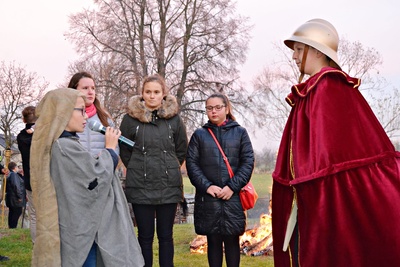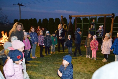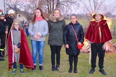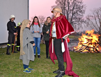 Gdy dotarli na plac za remizą OSP przy blasku ogniska odegrano scenę przedstawiającą legendę o św. Marcinie. Św. Marcin będąc rzymskim legionistą podzielił się połową płaszcza z napotkanym żebrakiem – to symbol jego wielkiego miłosierdzia.