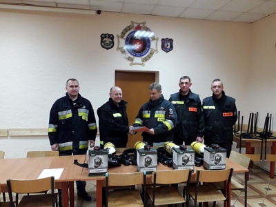 W ramach dobrej współpracy koledzy ochotnicy z Dylak otrzymali 4 kompletne sztuki – aparat, maska, butla i sygnalizator bezruchu.