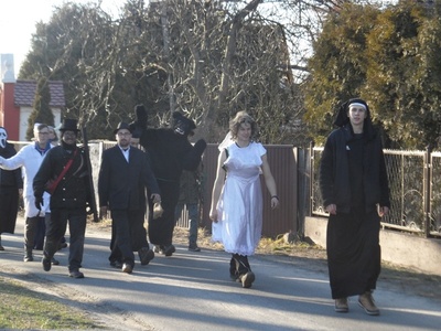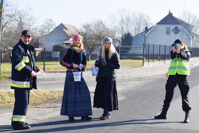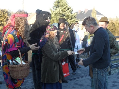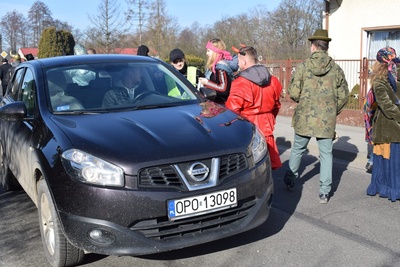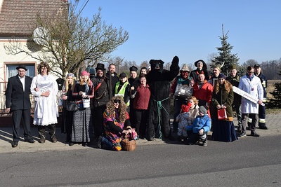 W sobotę , dnia 16.02. barwny korowód złożony z kilkunastu osób dotarł do domostw położonych po prawej stronie torów kolejowych w Krasiejowie. W orszaku prowadzonym przez olbrzymiego Bera, szli ksiądz, siostra zakonna, cyganki, kominiarz, para młodych, leśniczy, lekarz (re)habilitowany z ogromnym termometrem w rękach oraz grajkowie. W korowodzie nie zabrakło również dinozaura, który od lat kilkunastu towarzyszy wodzeniu niedźwiedzia w Krasiejowie i jest jego lokalnym symbolem. Za wszystkie datki i życzliwe przyjęcie Bera w domach mieszkańcom wsi dziękują członkowie OSP Krasiejów.