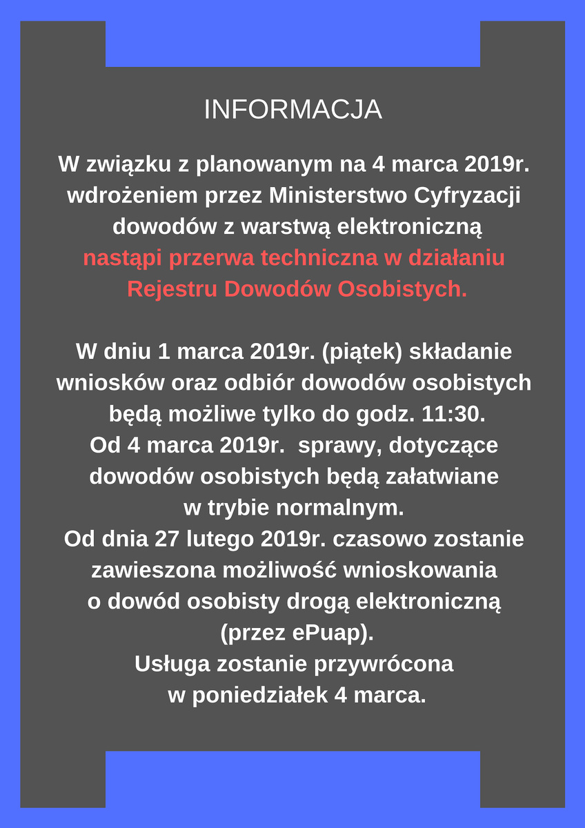 W dniu 1 marca 2019r. (piątek)składanie wniosków oraz odbiór dowodów osobistych będą możliwe tylko do godz. 11:30.