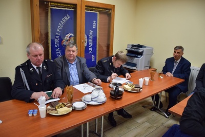 W zebraniu uczestniczyli m.in. burmistrz Jan Labus, prezes gminnych struktur ZOSP RP Marek Elis, kpt. Piotr Wieszołek opiekun z KM PSP w Opolu i radni miejscy Marceli Biskup, Tadeusz Markulak, Jan Polaczek i radny powiatowy Krzysztof Koźlik.