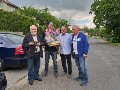 Z osobistymi życzeniami oraz pozdrowieniami Burmistrza Ozimka Jana Labusa i Rady Miejskiej w Ozimku jubilata odwiedzili przyjaciele z Ozimka w składzie – były Burmistrz Ozimka – Andrzej Sobczak – także współautor aktu partnerstwa z Rymarzowem, Werner Klimek – były Przewodniczący Rady Miejskiej w Ozimku oraz Marek Musiał – który jako radny był odpowiedzialny za sprawy związane z partnerstwem z Rymarzowem.