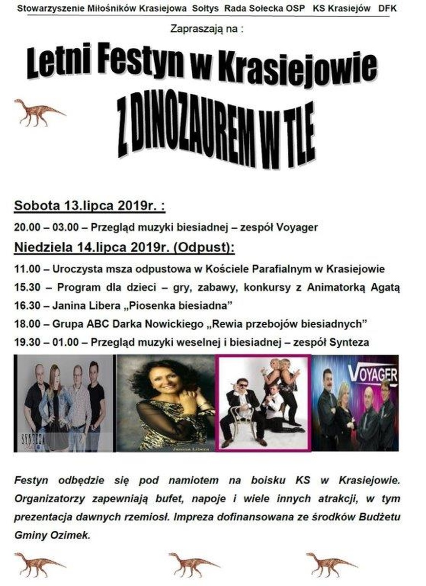 Serdecznie zapraszamy na Letni Festyn w Krasiejowie z Dinozaurem w Tle, który odbędzie się w dniach 13-14 lipca 2019 r. na boisku sportowym w Krasiejowie.