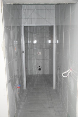 Firma Remontowo-Budowlana BATOREX s.c. z Krzepic realizuje wszystkie prace zgodnie z harmonogramem, właśnie trwa przygotowanie pomieszczeń sanitarnych oraz szlifowanie gładzi szpachlowej w głównym pomieszczeniu.