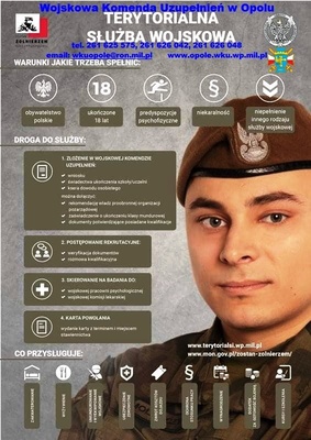 Osoby, które chcą zostać żołnierzem, sprawdzić swoje umiejętności strzeleckie, poznać podstawy survivalu oraz zasady udzielania pierwszej pomocy i specyfikę służby w WOT – mogą się zgłaszać się do Wojskowej Komendy Uzupełnień w Opolu, gdzie można uzyskać informację o warunkach służby w WOT, zasadach naboru czy też niezbędnych wymaganiach do spełnienia.