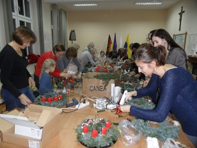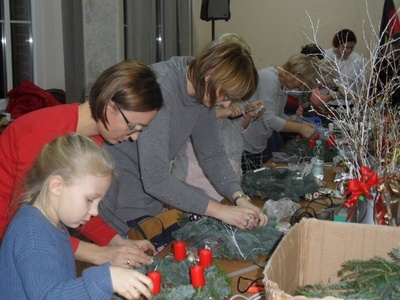 W piątkowy wieczór, dn. 29.11.2019r. w świetlicy "Starej Szkoły" spotkały się mieszkanki Krasiejowa, aby wziąć udział w adwentowo - świątecznych warsztatach florystycznych. Zajęcia prowadziła Katarzyna Sklorz, która od dwóch lat uczy nas wspaniałej sztuki tworzenia małych artystycznych dzieł. Do prac włączały się też dzieci, które na spotkanie przyszły razem z mamami lub babciami. Podczas warsztatów prowadzone były zajęcia językowe dla najmłodszych, które prowadziły panie Marzena Misz i Sylwia Widawska. Dzieci malowały, łączyły w pary symbole świąteczne, czytały wiersz o Mikołaju, gromadziły słownictwo wokół tematu adwent i Mikołaj. Prace artystyczne w postaci stroików powstałe pod okiem florystki Kasi wprawiły w zachwyt ją samą. Wszyscy bez wyjątku bardzo mocno angażowali się w wykonanie jak najpiękniejszego adwentowego stroika, a niektórym paniom udało się zrobić aż dwa. Spotkanie było okazją do miłego integrowania się, pielęgnowania śląskich tradycji, ale i okazją do posmakowania dobrego kołocza i wypicia smacznej kawy.