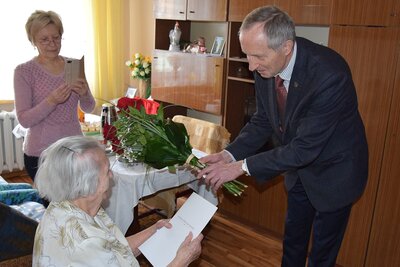 Pani Helena urodziła się w 1920 r. w Orenburgu (w ówczesnym ZSRR). Mimo, wielu lat cieszy się dobrym zdrowiem, czego dowiodła w rozmowie z Burmistrzem. Bardzo ucieszyła ją wizyta, a w szczególności, że mogła poznać także nowego burmistrza elekta.