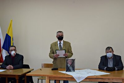 Po przywitaniu zebranych Pan Klimek przedstawił cel uroczystości, jakim było nadanie pośmiertnie tytułu "Zasłużony dla Krasiejowa" śp. Bernardowi Materne, który zmarł niespodziewanie dn. 8 listopada 2020 r., nie doczekawszy osobiście tego ważnego wydarzenia i poprosił o uczczenie minutą ciszy Jego pamięci. Kolejno Krzysztof Koźlik odczytał uzasadnienie nadania Panu B. Materne tytułu za zasługi i wieloletnią działalność społeczną na rzecz mieszkańców wsi, kościoła i organizacji działających na terenie naszej miejscowości, w którym czytamy: