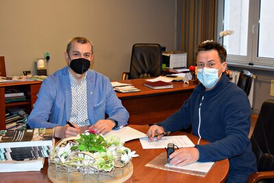 Dnia 16 kwietnia 2021 r. Burmistrz Ozimka Mirosław Wieszołek oraz Grzegorz Karaś - właściciel firmy PHU Ogrodnik podpisali umowę na zadanie pn. bieżąca pielęgnacja i utrzymanie zieleni na terenie miasta Ozimek w latach 2021 – 2022.