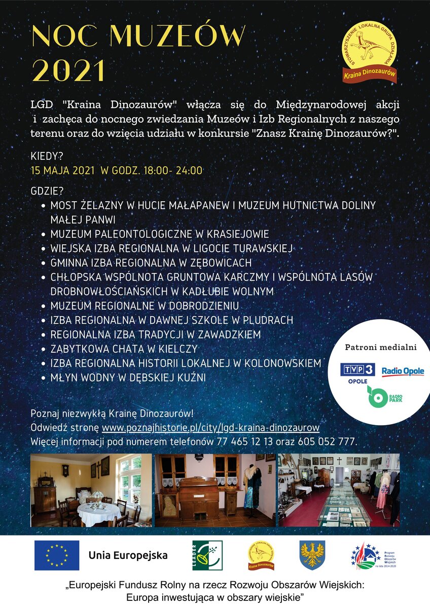 Serdecznie zapraszamy do udziału w konkursie ,,Znasz Krainę Dinozaurów’’ w ramach ,,Nocy Muzeów 2021’’. Konkurs jest realizowany w ramach Planu Komunikacji LGD ,,Kraina Dinozaurów’’. Działanie "Wsparcie dla rozwoju lokalnego w ramach inicjatywy LEADER" Poddziałanie: 19.4 - Wsparcie na rzecz kosztów bieżących i aktywizacji.